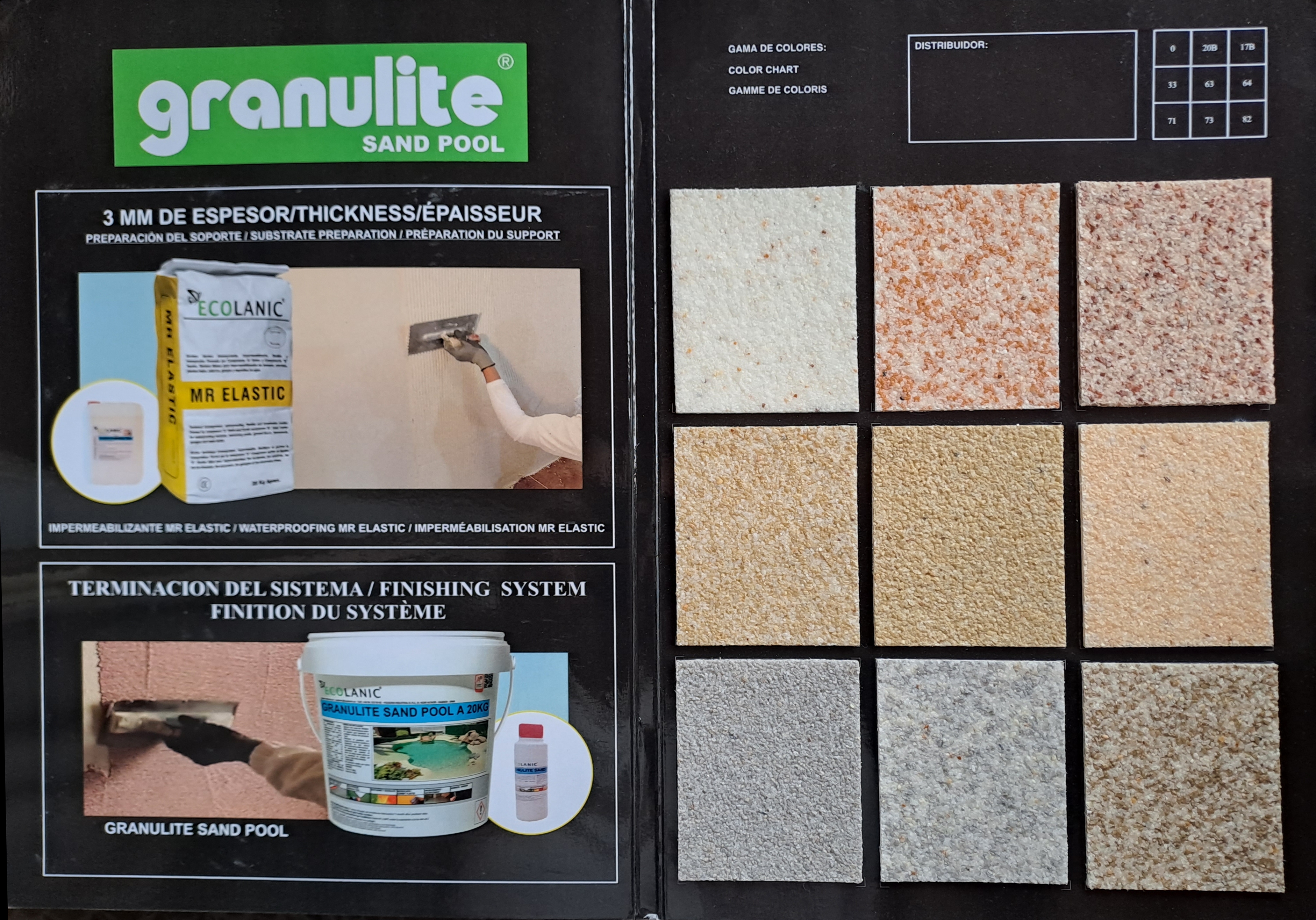 GRANULITE SANDPOOL is a two-component product based on polyurethane water, which is presented as component A in the form of a semi-solid paste, practically odorless, ready for mixing with component B, a catalyst that appears as a viscous liquid, which is transformed, once applied on the support, in a TRUE EPIDERMIS (or FILM OF MARBLE GRANULES and SILICONE) perfectly adhered to the support.